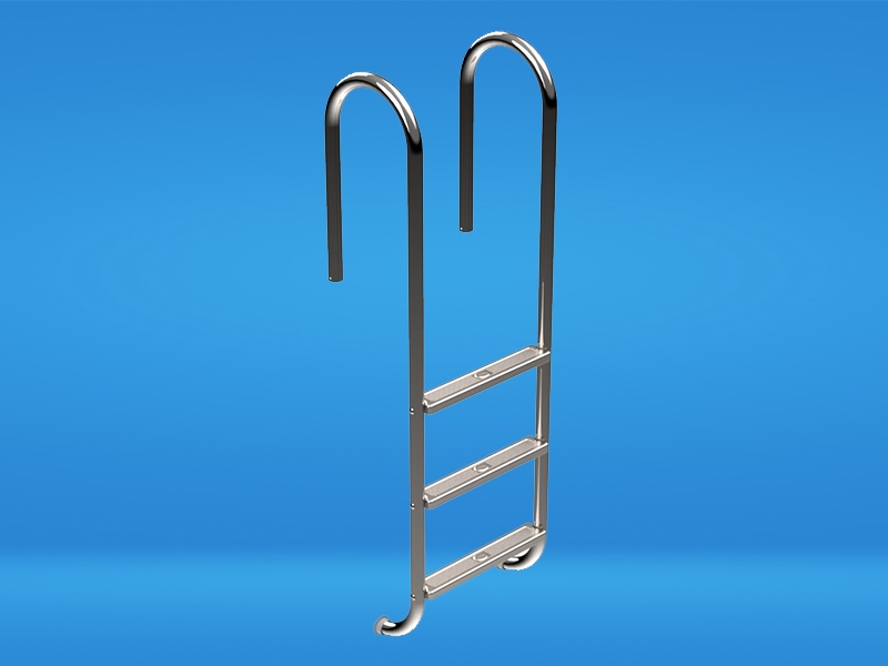 Edelstahl V4A, poliert, Holm Ø 40 mm, gleitsicher profilierte Stufen, Auftritttiefe 80 mm, senkrechter Stufenabstand 250/280 mm, Breite Mitte Mitte Holm 485 mm, Ausladung hinter Beckenkante 150 mm, Holmhöhe über dem Beckenrand 600 mm