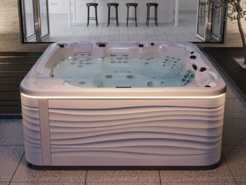 Darüber hinaus verfügt das Home Spa über vier LEDs, die eine einmalige, entspannende Atmosphäre schaffen und sich wie alle anderen Funktionen des Whirlpools über ein Touch-Display steuern lassen. Der hochwertige Whirlpool wird kunden angepasst in Acryl ausgeführt und ist mit den Verkleidungen Solid Surface erhältlich.