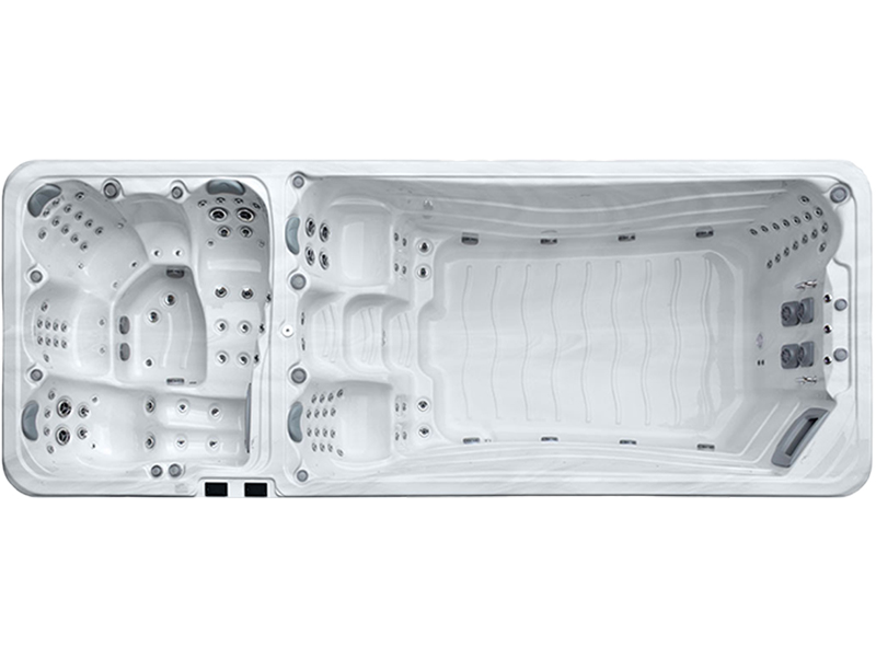 Der Oceanus SwimSpa Brisbane Pro ist ein zweigeteiltes SwimSpa mit getrenntem Whirlpoolbereich. Im Whirlpoolbereich sind 3 Sitzplätze und 2 Liegeplätze zu Verfügung, im Swimmspabereich sind 2 Sitzplätze und 1 Stehplatz zu Verfügung. Geniessen Sie die Vorzüge dieses Kombi-Gerätes im getrennt beheizbaren Schwimm- oder Whirlpoolbereich.
