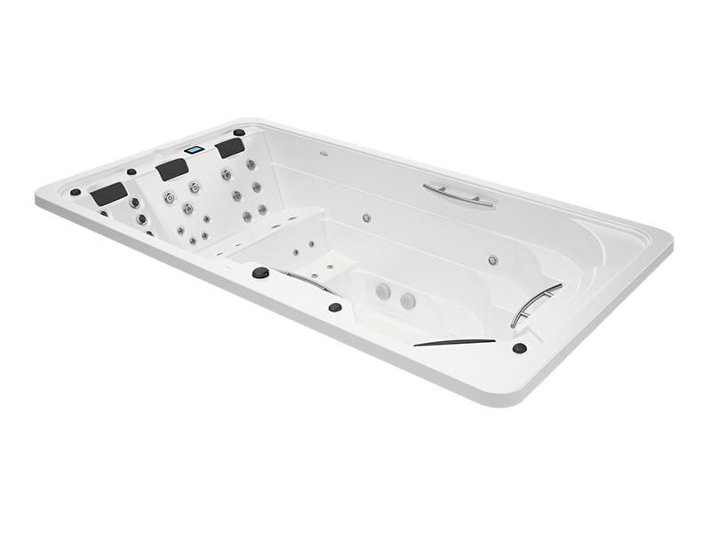 Das Schwimmbad ist ausreichend groß und seine 4 Gegenstromdüsen sind kräftig genug, um kontinuierlich gegen die Strömung schwimmen oder gehen zu können. Das Becken verfügt über zwei Edelstahlstangen, die für Aquafitness-Übungen Halt bieten. Nach dem Workout können Sie sich auf der Liege, einem der zwei Sitzplätze oder an der vertikalen Massagesäule entspannen.